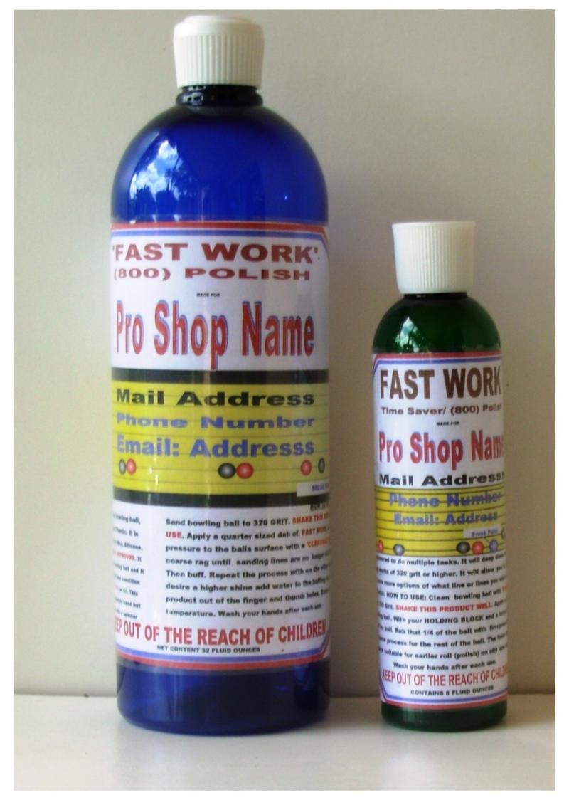 This product was developed to minimize the time it takes to resurface a bowling ball. Wet sand the bowling ball to 320 or 400 grit. Shake product vigorously. Apply FAST WORK to a clean course cloth then on to the bowling ball. Apply pressure until sanding marks are not visible, then buff. You can leave it at this level of polish (+/_ course 800 grit polish) or use COARSE/MEDIUM/FINE/LOW ABRASIVE Polish or *GO LONG* as conditions require. Great for texture changes and deep cleaning. Use by hand or with spinner . Available in 8 ounce and 32 ounce bottles.